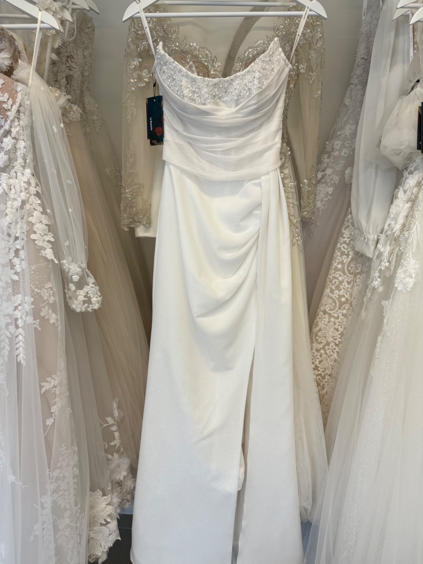 Luxusní svatební šaty s moderním střihem, rozparkem a korálkovým korzetem vykniknete na vaši svatbě a budete hvězdou vašeho dne, šaty sedí na velikost 34-36, cena půjčovného 17000 kč a cena prodeje je 36000 kč
